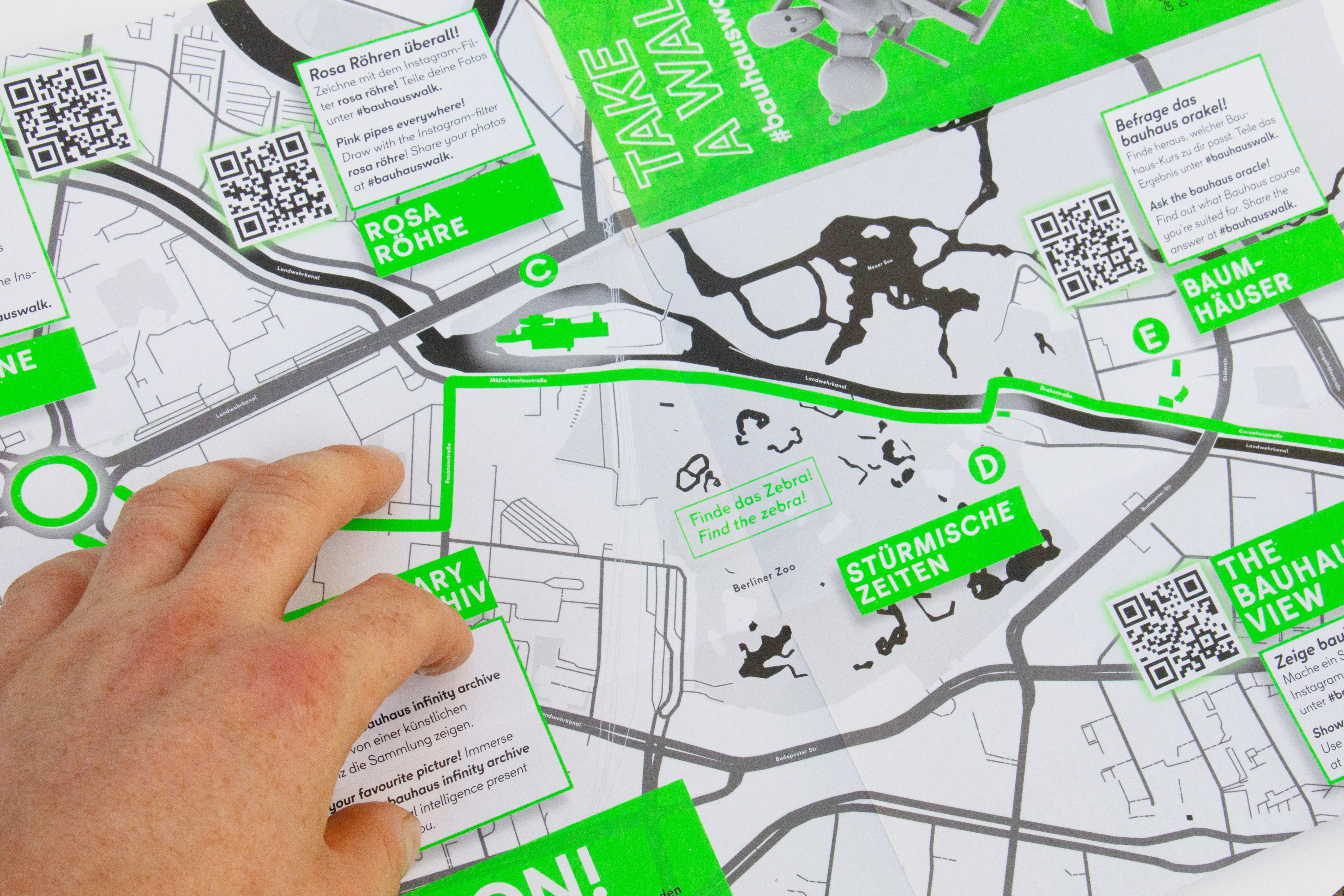 In collaboration with the Bauhaus Archive Berlin, we developed the #bauhauswalk. The complete package of print product and Instagram filters enables visitors to go on an architectural walk and connects the two interim sites Bauhaus VIEW and Bauhaus TEMPORARY via selected architectural highlights. In addition to short profiles of the sites, visitors have the opportunity to carry out activating tasks with the help of Instagram filters developed for this purpose. The results are then published on social media channels using the hashtag #bauhauswalk.